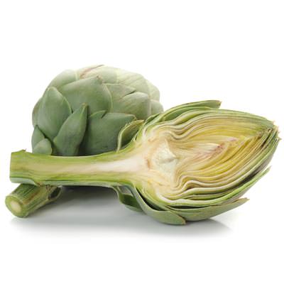 La alcachofa alcanza de 1,4 a 2 metros de altura. Vuelve a brotar de la cepa todos los años, pasado el invierno, si el frío no la heló. Echa un rosetón de hojas enteras hasta profundamente segmentadas aunque menos divididas que las del cardo y con pocas o ninguna espina. Las hojas tienen color verde claro en el haz y en el envés están cubiertas por unas fibillas blanquecinas que le dan un aspecto pálido. Tanto el rabillo de la hoja como la vena principal tienen costillas longitudinales muy salientes.